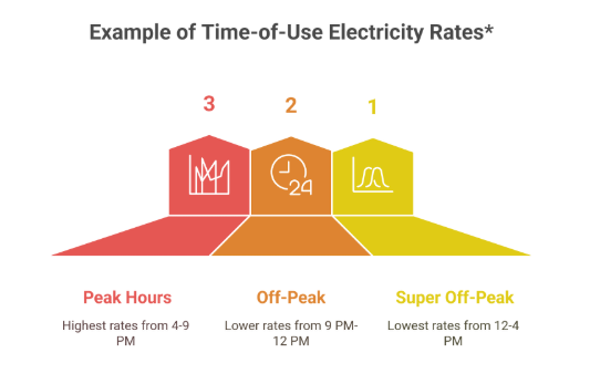 - Time-of-Use (TOU) rates: Electricity prices change based on the time of day.